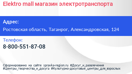 Elektro-mall, магазин электротранспорта по адресу Ростовская область, Таганрог, Александровская, 124 в дальнейшем Организация, размещена в следующих категориях: