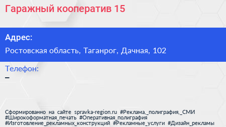 Гаражный кооператив №15 по адресу Ростовская область, Таганрог, Дачная, 102 в дальнейшем Организация, размещена в следующих категориях: