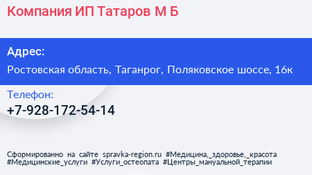Компания, ИП Татаров М.Б. по адресу Ростовская область, Таганрог, Поляковское шоссе, 16к в дальнейшем Организация, размещена в следующих категориях: