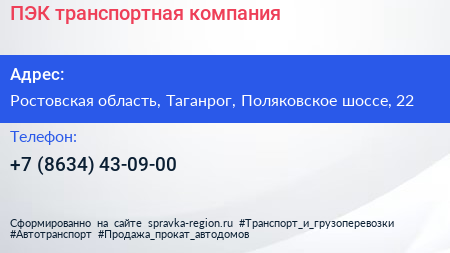 ПЭК, транспортная компания по адресу Ростовская область, Таганрог, Поляковское шоссе, 22 в дальнейшем Организация, размещена в следующих категориях: