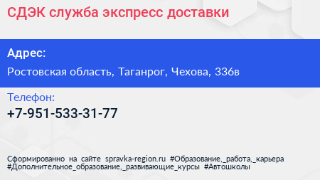 СДЭК, служба экспресс-доставки по адресу Ростовская область, Таганрог, Чехова, 336в в дальнейшем Организация, размещена в следующих категориях: