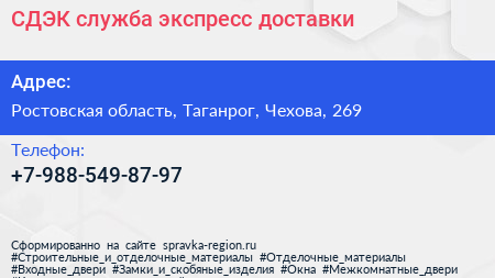 СДЭК, служба экспресс-доставки по адресу Ростовская область, Таганрог, Чехова, 269 в дальнейшем Организация, размещена в следующих категориях: