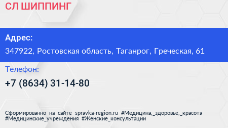 СЛ ШИППИНГ по адресу 347922, Ростовская область, Таганрог, Греческая, 61 в дальнейшем Организация, размещена в следующих категориях: