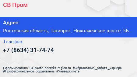 СВ Пром по адресу Ростовская область, Таганрог, Николаевское шоссе, 5Б в дальнейшем Организация, размещена в следующих категориях: