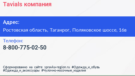 Tavials, компания по адресу Ростовская область, Таганрог, Поляковское шоссе, 16в в дальнейшем Организация, размещена в следующих категориях: