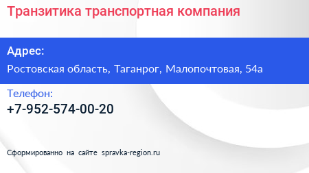 Транзитика, транспортная компания по адресу Ростовская область, Таганрог, Малопочтовая, 54а в дальнейшем Организация, размещена в следующих категориях: