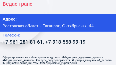 Ведас-транс по адресу Ростовская область, Таганрог, Октябрьская, 44 в дальнейшем Организация, размещена в следующих категориях: