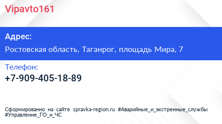 Vipavto161 по адресу Ростовская область, Таганрог, площадь Мира, 7 в дальнейшем Организация, размещена в следующих категориях: