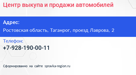 Центр выкупа и продажи автомобилей по адресу Ростовская область, Таганрог, проезд Лаврова, 2 в дальнейшем Организация, размещена в следующих категориях: