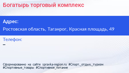 Богатырь, торговый комплекс по адресу Ростовская область, Таганрог, Красная площадь, 49 в дальнейшем Организация, размещена в следующих категориях: