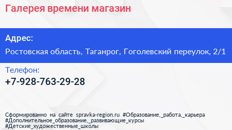 Галерея времени, магазин по адресу Ростовская область, Таганрог, Гоголевский переулок, 2/1 в дальнейшем Организация, размещена в следующих категориях: