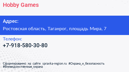 Hobby Games по адресу Ростовская область, Таганрог, площадь Мира, 7 в дальнейшем Организация, размещена в следующих категориях: