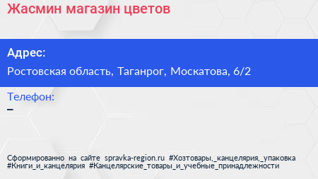 Жасмин, магазин цветов по адресу Ростовская область, Таганрог, Москатова, 6/2 в дальнейшем Организация, размещена в следующих категориях: