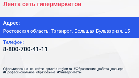 Лента, сеть гипермаркетов по адресу Ростовская область, Таганрог, Большая Бульварная, 15 в дальнейшем Организация, размещена в следующих категориях: