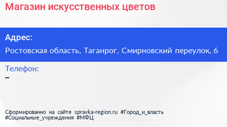 Магазин искусственных цветов по адресу Ростовская область, Таганрог, Смирновский переулок, 6 в дальнейшем Организация, размещена в следующих категориях: