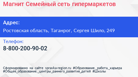 Магнит Семейный, сеть гипермаркетов по адресу Ростовская область, Таганрог, Сергея Шило, 249 в дальнейшем Организация, размещена в следующих категориях: