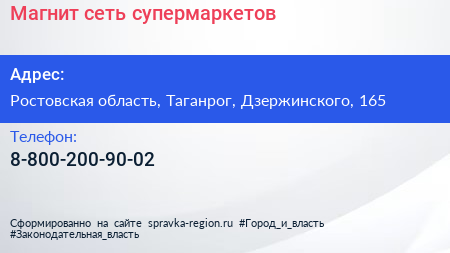 Магнит, сеть супермаркетов по адресу Ростовская область, Таганрог, Дзержинского, 165 в дальнейшем Организация, размещена в следующих категориях: