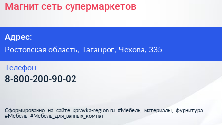 Магнит, сеть супермаркетов по адресу Ростовская область, Таганрог, Чехова, 335 в дальнейшем Организация, размещена в следующих категориях:
