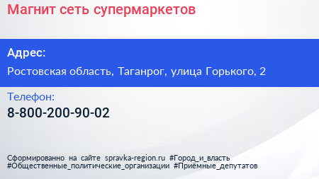 Магнит, сеть супермаркетов по адресу Ростовская область, Таганрог, улица Горького, 2 в дальнейшем Организация, размещена в следующих категориях: