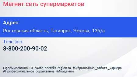 Магнит, сеть супермаркетов по адресу Ростовская область, Таганрог, Чехова, 135/а в дальнейшем Организация, размещена в следующих категориях: