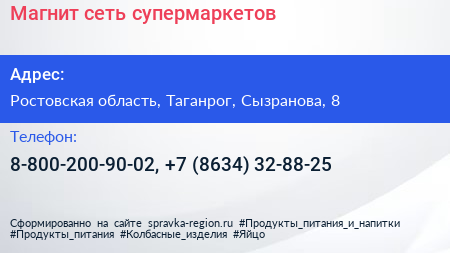 Магнит, сеть супермаркетов по адресу Ростовская область, Таганрог, Сызранова, 8 в дальнейшем Организация, размещена в следующих категориях: