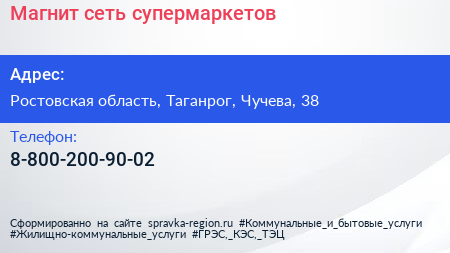 Магнит, сеть супермаркетов по адресу Ростовская область, Таганрог, Чучева, 38 в дальнейшем Организация, размещена в следующих категориях: