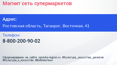 Магнит, сеть супермаркетов по адресу Ростовская область, Таганрог, Восточная, 41 в дальнейшем Организация, размещена в следующих категориях: