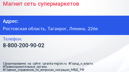 Магнит, сеть супермаркетов по адресу Ростовская область, Таганрог, Ленина, 226е в дальнейшем Организация, размещена в следующих категориях: