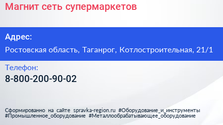 Магнит, сеть супермаркетов по адресу Ростовская область, Таганрог, Котлостроительная, 21/1 в дальнейшем Организация, размещена в следующих категориях: