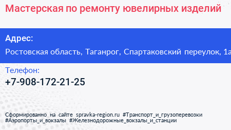 Мастерская по ремонту ювелирных изделий по адресу Ростовская область, Таганрог, Спартаковский переулок, 1а в дальнейшем Организация, размещена в следующих категориях: