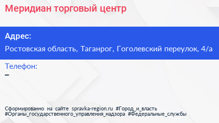 Меридиан, торговый центр по адресу Ростовская область, Таганрог, Гоголевский переулок, 4/а в дальнейшем Организация, размещена в следующих категориях: