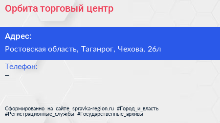 Орбита, торговый центр по адресу Ростовская область, Таганрог, Чехова, 26л в дальнейшем Организация, размещена в следующих категориях: