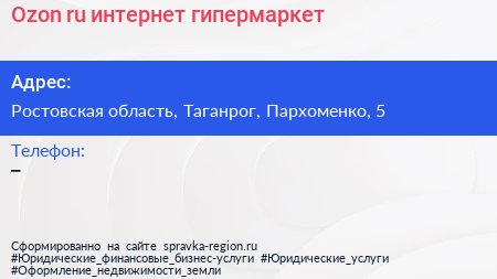 Ozon.ru, интернет-гипермаркет по адресу Ростовская область, Таганрог, Пархоменко, 5 в дальнейшем Организация, размещена в следующих категориях: