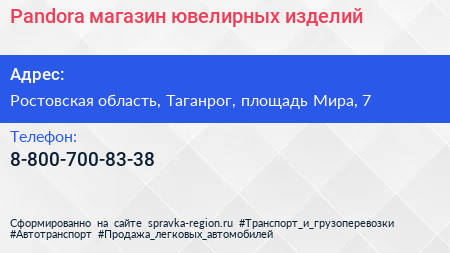 Pandora, магазин ювелирных изделий по адресу Ростовская область, Таганрог, площадь Мира, 7 в дальнейшем Организация, размещена в следующих категориях: