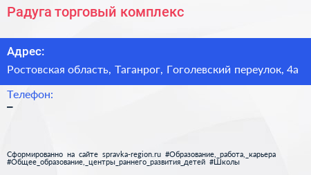 Радуга, торговый комплекс по адресу Ростовская область, Таганрог, Гоголевский переулок, 4а в дальнейшем Организация, размещена в следующих категориях: