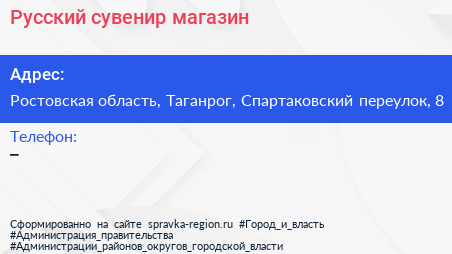 Русский сувенир, магазин по адресу Ростовская область, Таганрог, Спартаковский переулок, 8 в дальнейшем Организация, размещена в следующих категориях: