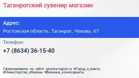 Таганрогский сувенир, магазин по адресу Ростовская область, Таганрог, Чехова, 67 в дальнейшем Организация, размещена в следующих категориях: