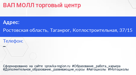 ВАП МОЛЛ, торговый центр по адресу Ростовская область, Таганрог, Котлостроительная, 37/15 в дальнейшем Организация, размещена в следующих категориях: