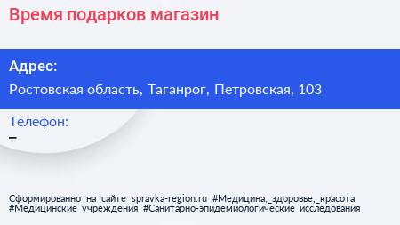 Время подарков, магазин по адресу Ростовская область, Таганрог, Петровская, 103 в дальнейшем Организация, размещена в следующих категориях: