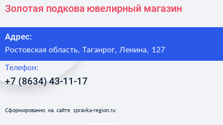 Золотая подкова, ювелирный магазин по адресу Ростовская область, Таганрог, Ленина, 127 в дальнейшем Организация, размещена в следующих категориях: