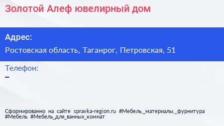 Золотой Алеф, ювелирный дом по адресу Ростовская область, Таганрог, Петровская, 51 в дальнейшем Организация, размещена в следующих категориях: