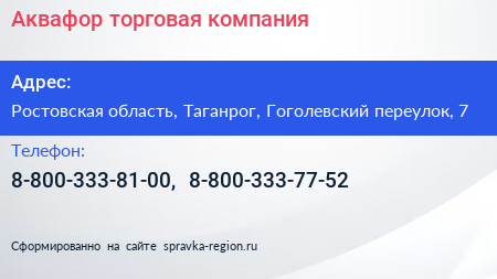 Аквафор, торговая компания по адресу Ростовская область, Таганрог, Гоголевский переулок, 7 в дальнейшем Организация, размещена в следующих категориях: