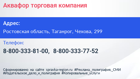 Аквафор, торговая компания по адресу Ростовская область, Таганрог, Чехова, 299 в дальнейшем Организация, размещена в следующих категориях: