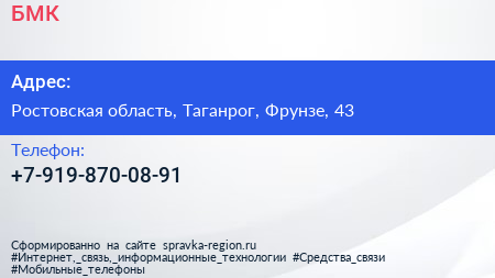 БМК по адресу Ростовская область, Таганрог, Фрунзе, 43 в дальнейшем Организация, размещена в следующих категориях: