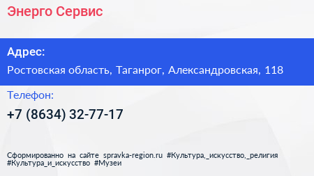 Энерго-Сервис по адресу Ростовская область, Таганрог, Александровская, 118 в дальнейшем Организация, размещена в следующих категориях: