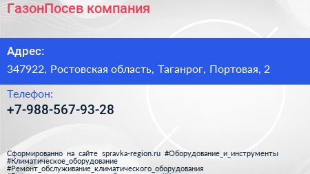 ГазонПосев, компания по адресу 347922, Ростовская область, Таганрог, Портовая, 2 в дальнейшем Организация, размещена в следующих категориях: