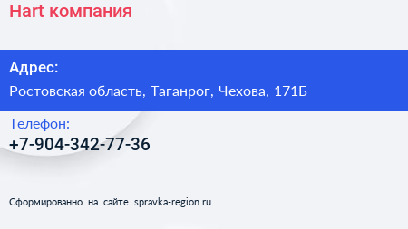 Hart, компания по адресу Ростовская область, Таганрог, Чехова, 171Б в дальнейшем Организация, размещена в следующих категориях: