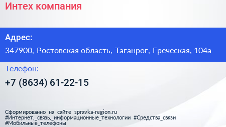 Интех, компания по адресу 347900, Ростовская область, Таганрог, Греческая, 104а в дальнейшем Организация, размещена в следующих категориях: