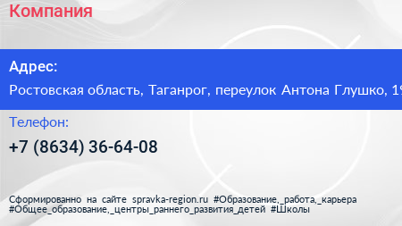 Компания по адресу Ростовская область, Таганрог, переулок Антона Глушко, 19 в дальнейшем Организация, размещена в следующих категориях: