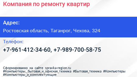Компания по ремонту квартир по адресу Ростовская область, Таганрог, Чехова, 324 в дальнейшем Организация, размещена в следующих категориях:
